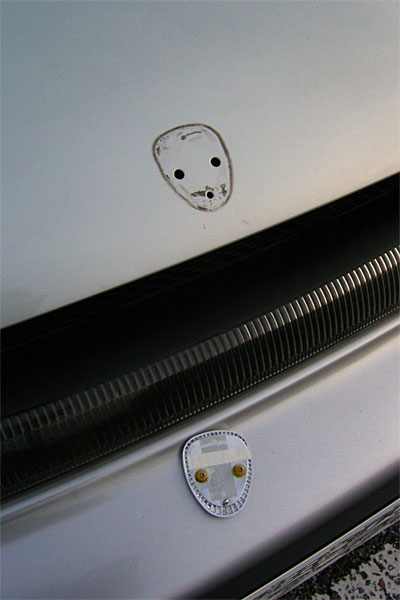 作業はさらに続く、先日のオフ会で見た青地のエンブレムのマネをしたくて、エンブレムとのスキマを縫い糸でコシコシ。ボンネットからは意外とあっさり外れる……が、エンブレムの色を変えるにはエンブレム表面の透明な部分を外さなきゃならんのにコレはどうにも外れない。シンナー中毒間近でギブアップである。とりあえず元に戻す。むー、今後の課題だな。
