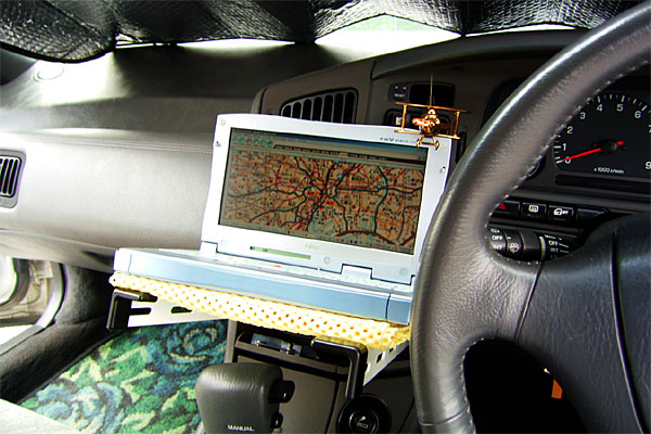 今日は、ホームセンターに買い物へ。出る前、試しにサブノートPCをナビとして載せてみた。以前にソアラで組んでいた鉄材を簡単に組んでカーステの下の空きボックスに刺し、その上に載せただけ。意外としっかりと置けたが、ハンドルを回す手に若干干渉ぎみなのヤバい。もう少しちゃんと組まなければダメか?