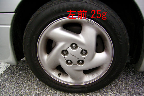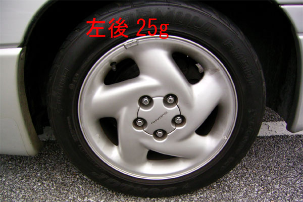 ホームセンターを後にし、懸案だった高速道路での振動をなんとかするため、ホイールバランスを取り直しにタイヤ館へ。というか、取り直すもなにも、左のホイールにはバランスウェイト自体がなかったのであるが。案の定「左のホイールは盛大にバランスが崩れていましたよ」とのコメントを頂いた。両方とも25gって結構な量だよね。