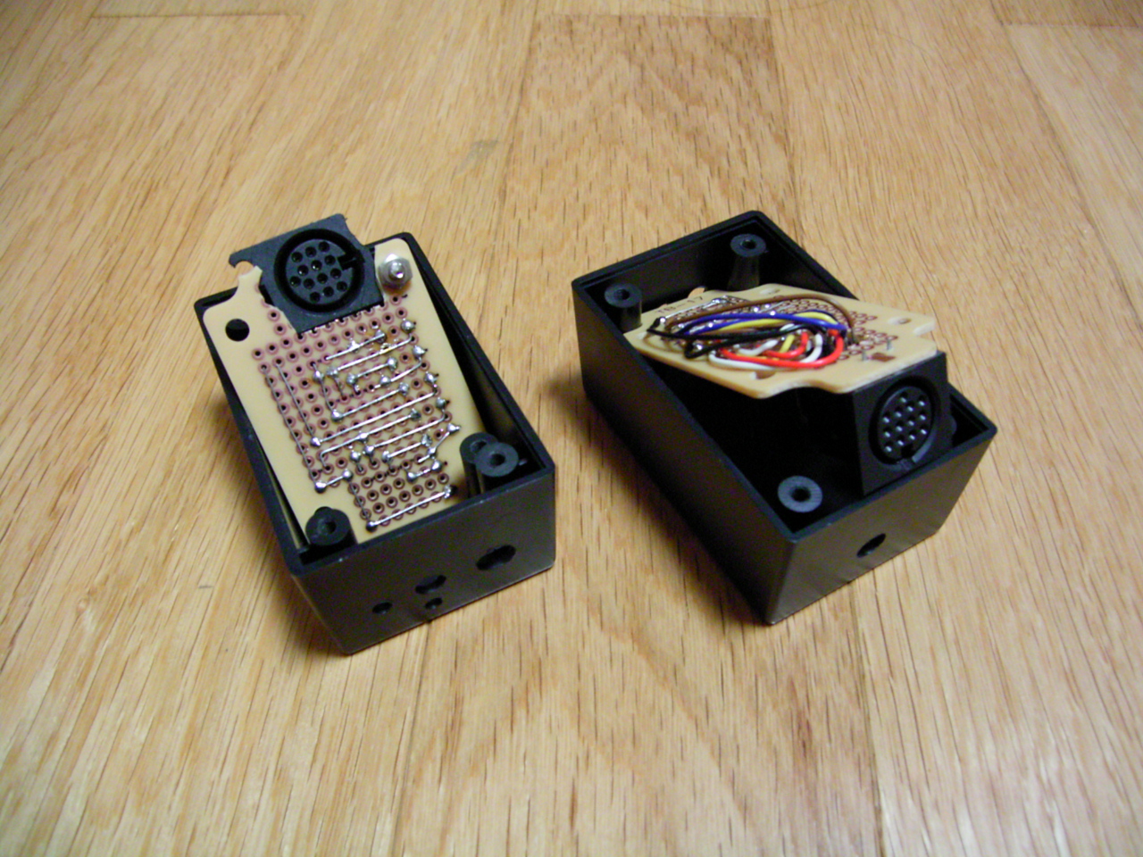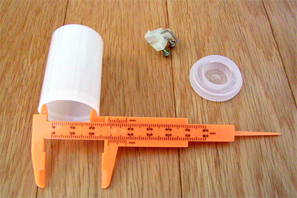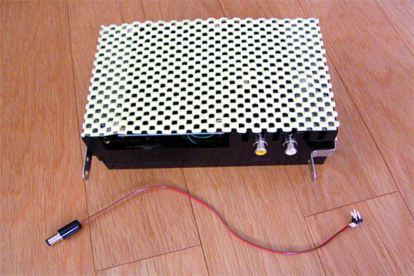 で、加工した結果がこれ。基板は2個のネジ穴と、ちょっと太目の足を通すための加工を施した。なかなかうまく行った感じ。しかし、フィルムケースが柔らかくて加工しやすいのは発見だった。大きさも適当だし、ちょっとした電子工作のケースには持ってこいかも。富士フィルム万歳(?)である。