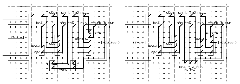 概ね作戦が決まったところで、回路図を書く。といっても私の場合、回路図は紙の上にラフに書くだけで済ませ、回路図CADで実体配線図を書き始めてしまう。当然、回路図CADの本来の使い方ではないが、私にはこのやり方が合っているようだ。しかし、この実体配線図の部品配置と配線をあーでもないこーでもないと煮詰めていくのは、これまた楽しい。一応、ポリシーとして部品面にはジャンパがないように、配線面には交差がないようにと、勝手に決めているのでそれに従う。完成したのが以下の図である。