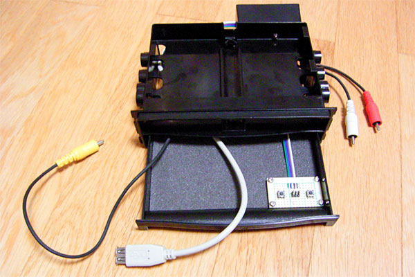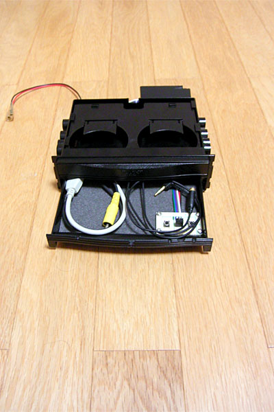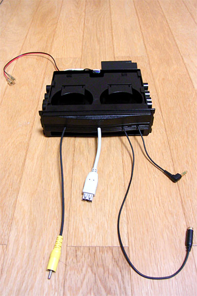 フロント側のDINスペース側の変換ボックスには、RCA-Videoオスコネクタ、RCA-Audioオスコネクタx2(左右)、USB-Aタイプメスコネクタ、PCパワースイッチ、PCリセットスイッチ、謎のオス6pinフレームとなっている。このうち、RCA-Audioは既存のMP3対応ヘッドユニットアンプに接続するため後ろ出しで、それ以外はDINスペースに収納するボックスの引き出し内に収納されている。