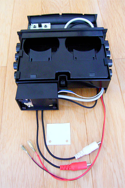 ここでは15分ほど悩んでヒトツの答えを出した。よく考えたら、MP3ヘッドユニットにはフロントパネル側からミニプラグによる入力が可能なものを選んでいたのだ。若干ダサいが引き出しにもう1本ミニプラグによる音声出力端子を出し、必要な場合はフロントから差し込むようにするのだ。というか、MP3ヘッドユニットの裏にある入力端子は特殊形状なので、もう、それしかないのである。