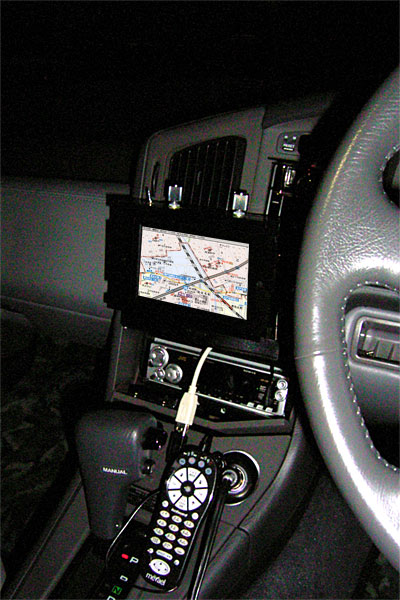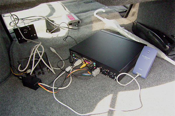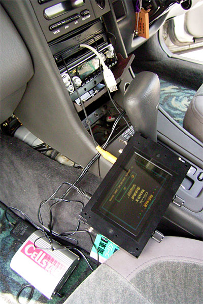 ちなみに、行き帰りは常磐自動車道と外環の下を通ったのだが、当然、昨日搭載したばかりの車載PCは活躍しまくりである。まず、オフ会に向かう前。無線LANによるデータ転送を試してみる。直線距離で100mほど離れている駐車場でSVXに乗り込み、車載PCを起動。電波は……届かない。アパートの裏を通ると、お、届く。では、アパートの前では……バッチリだ。サクッと家のLinuxサーバにsambaアクセス。昨日準備しておいた、村下孝蔵のアルバムデータを車載PCに数分でダウンロード。むふーん、甘露である。すぐさま、そのアルバムを再生しながら移動できるのだ。しかもジャケット写真つき。これはヤメられんぞ。ナビに関しては、トンネルの多い常磐自動車道や、高架下の外環の下道であるから、予想通り画面が動かなくなった。しかし、ナビにそこまでの期待はしていないのでこれでいいのだ。トンネルは一本道だし、高架下はたまに左車線に行けば概ね位置が拾えたし。なお、下のイメージ写真はハメ込み合成です。……って、一度やってみたかったんだよね、ハメ込み合成。