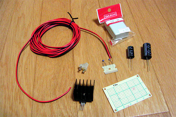 DC-DCコンバータの定番は3端子レギュレータというもの。今回は1.25Vから15Vまで出力電圧を可変できる、LT1084CTを利用する。この石は13V程度の入力があればキレイな12Vを出力してくれる便利な石だ。そのため小さい割に1,410円とお値段も張るので、扱いには注意である。まずは部品集め。不安定な電圧の安定にはデカいコンデンサということで、入力側に2200uF、出力側に1000uFの電解コンデンサを配置である。