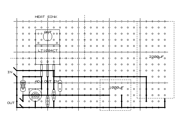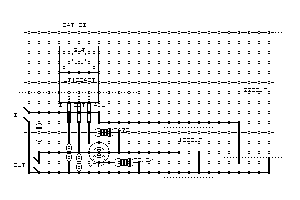 LT1084CTのデータシートによればR2に90Ω程度、R1に1kΩの可変抵抗を与えて調整するようになっている。しかし、両者とも手持ちのストックにはなく、90Ω近辺の抵抗は10,75,470Ωしかない。とりあえず、大き目のほうがよいだろうということで470ΩをR2(図で上部の抵抗器)に与えてみる。で、R1(下部の抵抗器)に必要な抵抗値を逆算すると4042Ωである。再び部品箱をひっくり返すと3.3kΩの抵抗器がある。ということは、1kΩの可変抵抗を直列につなげばちょうどよく調整できそうである。理論では、ここで10kΩの可変抵抗のみをつないでもよいのだが、おそらく12Vに調整するのがかなりセンシティブになってしまうと思われる。やはり1kΩの可変抵抗がよい。が、手持ちにない。ということで、ジャンクから取り外すことを考えた。すると、以前使っていた自作のノートPC用電源回路に載っていることを発見。今は別途ACアダプタを利用してノートPCを駆動しているので、そこから失敬することにした。で、完成したのが以下の回路である。