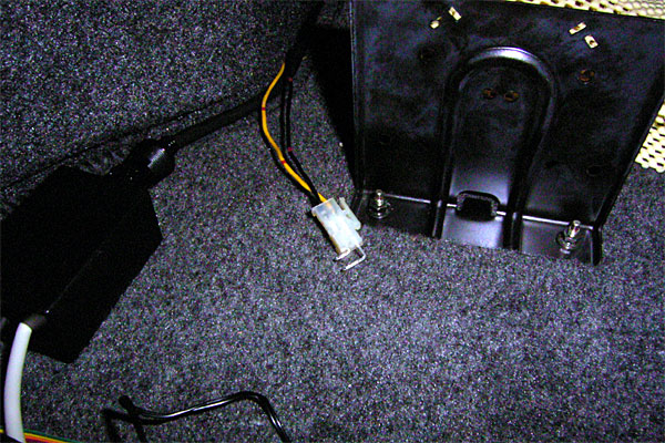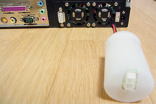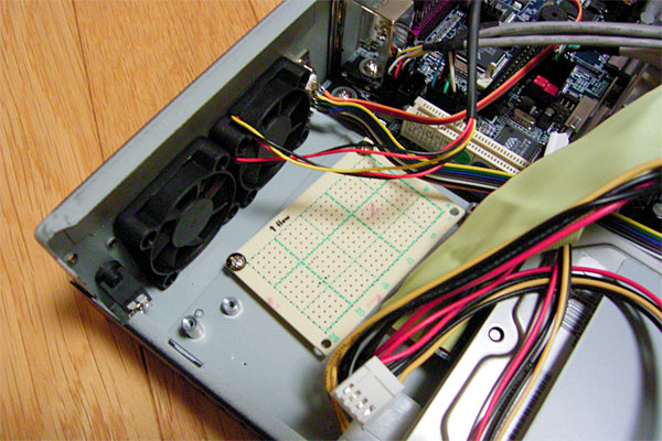 9pinソケットは刺し違い防止のためCOM1のそれとはメスオス逆にしてあり、ケーブルを通じて2つのpinソケットにつながっている。10pinの方は謎の6pinからきている信号線である。カンのいい人はどこにつながるのかわかるかもしれないが、一応まだ秘密。18pinの方は通常、ケースのスイッチやLEDをマザーに刺す部分に代わりに装着することにより、外部から電源やリセットが行えるようにする。LEDに関してはまだ装着予定はないが、ゆくゆくはバックミラーでLEDが確認できるようにしたら面白いかもしれない(CDチェンジャー用のケーブルを流用する都合で13pinにはもう空きがなく、前方のDINスペースまでLEDを引っ張ることはできないので)。