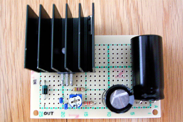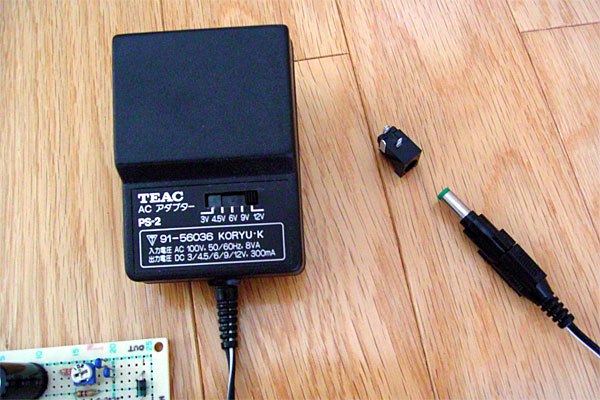 相変わらずハンダ付けはうまくならないなぁ、とハンダ面を見てナゲキつつもテストである。テストには14V以上の適当な電源が必要なので、手持ちの可変ACアダプタを利用するのである。この可変ACアダプタ、おいらが電子工作を始める前に買ったもので、かなり放ってあったアイテムなのだが、今考えるとこれって素人が使うとアブないよねぇ。ちなみにスイッチングタイプでなくトランスタイプなので15Vに合わせても軽く17Vを搾り出すアバウトな野郎である。今回は電流出力せず電圧を測るだけなので、ザックリ17Vを入れ、12Vが出るか確認してみるのである。