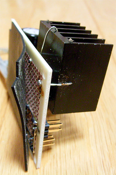 ベロベロしているのは絶縁用のゴムシートである。基板のPCケースへの固定は上部のネジ2本による不安定な片持ち状態なので、念仏代わりである。また、ヒートシンク上部から伸びているスズメッキ線は、配線材と同じ物だが、若干テンションを与えてヒートシンクを基板に固定している。当初、ヒートシンク脇部の線でハンダ付けして固定しようと思ったのだが、ハンダが付かなかったため、苦肉の策である。んが、意外といい感じ。今回の3端子レギュレータの場合、ヒートシンク自体にも12Vが来ていることも忘れてはならない。車載を考えると振動対策として多少は考慮すべきかと思っての対処である。