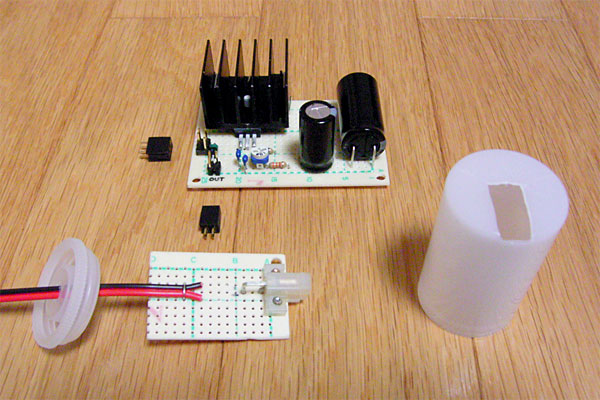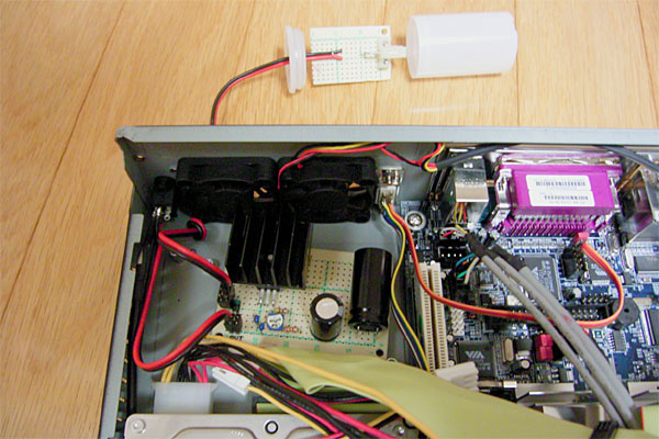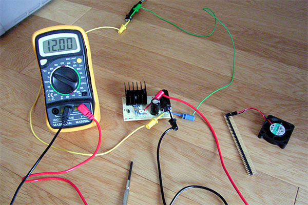 デカいコンデンサのせいか、端子を接続するときに「バチバチッ」とやってアセったり、入力端子との電圧を測りながら可変抵抗をイジって「17V出力回路完成!!……じゃねーだろ!!」などとひとり乗りツッコミしたりしたが、最後にはちゃんと12Vを得ることができた。ついでに12Vのファンを回して電流でも測ってみようかと思ったのだが、テスターのヒューズが飛んでて電流計測不可。ぐむむ。こんどポリスイッチ買ってきて交換してやる。そういえば、今回の回路にも追加したほうがよさそうだな、ブツブツ……と。