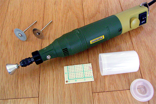 で、次は昨日のフィルムケース大作戦の続きである。今回、車側のCDチェンジャー用の電源供給端子を利用するので、CDチェンジャーからジャックを失敬した。しかし、ジャックの形状が形状なので、ムキ出しで使うと非常に危険である。で、当初は小さなケースに入れて利用しようかと思ったのだが、これだけのことにキレイなケースを利用するのももったいないので、考えついたのがフィルムケース大作戦である。まずはルータで基板をガリガリとフィルムケースの内部に入るように削るのである。ちなみに今回、先日新たに購入した回転ノコギリアタッチメントを利用しての切断を試したのだが……ダイヤモンドカッターで削るより、非常に難しかった。キリシロは非常に狭くてよいのだが、ノコ歯があさっての方向に行くわ、勝手に暴れて基板をキズだらけにするわ、オマエは妖刀村正か。あきらめてサッサと得物をダイヤモンドカッターに替えて作業を継続。結局こっちで十分であった。うー、失敗。