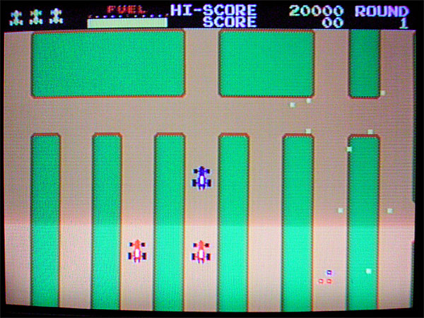 これはオリジナルと同じ横画面なのだが、なんとレーダー画面がない。厳密に言うとレーダー画面はあるのだが、メインのコース画面の上にドットがオーバーラップ表示されているのである。そのため、若干レーダー画面が判読しづらいのが残念である。ニューラリーXではないので、車はエラがない形状であり、ラッキーフラッグも存在しないが、なぜかレーダー上でスペシャルフラッグが点滅している。コースに関しては詳しく覚えていないのでオリジナルとの比較はできないが、特に違和感を感じるほどのヘンなコースではない。ニューラリーXではないため、袋小路的が多いのもオリジナルに準じている。レッドカーの動きに関しては若干追いかけがキツい感じだが、代わりといってはなんだが相互にブツかってマゴつくことが多く感じる。このヘンは私の感覚なのでなんともいえないが。チャレンジングステージもちゃんとあり、燃料切れになるとレッドカーが動き出す。スタート直後に下に移動すると、レッドカーをスリ抜けるワザも再現されている軽快なBGM、効果音に関しても十分にオリジナルを再現している。レーダーの件はあるが、移植度は高いといえよう。