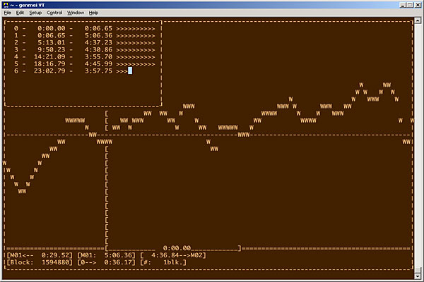 起動は「cccdct wavfile」。すぐさま、擬似ウィンドウが開く。画面左寄りの'['がカーソル位置。HとLで左右に大きく移動、shift+Hとshift+Lで左右に1カラム移動、JとKで拡大縮小である。切りたいポイントをカーソル位置に合わせて、スペースでマーク。Pでカーソル位置から3秒間を即席演奏することもできる。Mで各ファイルの長さを確認しつつ、チョキチョキと切り終わったら、shift+Wで一気に出力、shift+Qで終了である。いい忘れたが?でオンラインヘルプも出る。実は無音判定による自動マーキング機能(shift+A)もあるが、あまりデキは良くない。下手に使うより、フツーに切ったほうが正確で早いと思うが、ヤル気のある人は、ソースを読んでcccdct.conf.rbの内容を調整したりしてみてほしい。