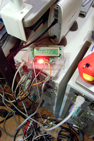 ちなみに自宅のLinuxサーバにはスピーカがつながっていない。では、音はどこから出るかというと、接続されているFMモジュレータから電波として出るのである。このFMモジュレータ、秋月のLCDパネルキットに私が追加改造したリモート電源プラグ対応にしてある。早い話がPC側からのコントロールにより必要なときだけFMモジュレータの電源が入れられるようになっているのである。よって、これもcrontabに登録するのである。