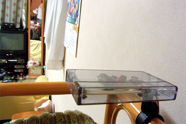 ちなみに今回、基板固定用に初めて皿ネジを利用してみた。ネジ頭がケースに埋没するタイプのネジで、見た目が多少よくなる。ただし、このネジを利用する場合、ネジ穴側をスリ鉢状に加工しなければならない点が面倒なのである。常々、専用の工具があれば欲しいと思っているトコロなのだが、今回は試しに手持ちの一番太い8mmの電動用ドリルをネジ穴にあてがって、手でウリウリと削ってみた。結果、ピッタリとはいかないが、半分以上ネジを穴を埋めることに成功した。今回タッパーの裏には若干出っ張っている部分があるので、これでネジがテーブルに直接当たることはなくなったが、やはり完全にネジを埋めてみたいものだ。今度、秋葉で専用工具の存在について聞いてみることにしよう。