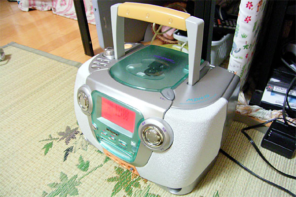 左の写真は、電話台に固定してあるPC接続型学習リモコンである。もちろんケーブルはLinuxサーバに接続されている。これにより、エアコン、テレビ、ケーブルチューナ等をLinuxサーバから制御することが可能となっている。右の写真が新たに今回から制御されることになったラジカセである。