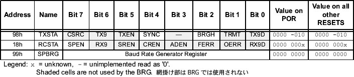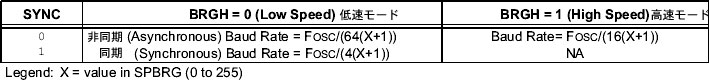| bit 2 | BRGH: 高速ボーレートモード選択ビット 非同期通信モード 1 = 高速ボーレートモード 0 = 低速ボーレートモード 同期通信モード 使用しない |