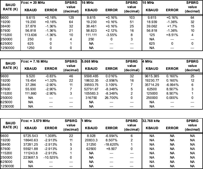 2. 望むボーレートが得られるようにSPBRGレジスタを設定します。高速ボーレートモードを利用する場合は、BRGHビットもセットします(12.1節 USARTボーレートジェネレータ(BRG)参照)。