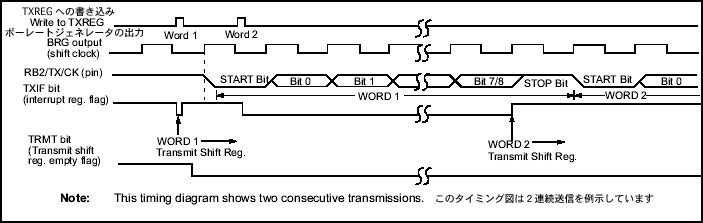 ソフトウェア側で送信データを読み書き送信バッファ(TXREG)に設定しておくと、自動的にTXREGからTSRにデータが転送され、送信が開始されます。転送は直前の送信データのストップビットの送信直後(データが存在する場合)のタイミングに、1インストラクションサイクルで行われます。転送が完了するとTXREGレジスタは空になり、TXIFフラグ(PIR1<4>)がセットされます。事前にTXIEビット(PIE1<4>)を設定しておくと、この時点で割り込みを発生することもできます。なお、TXIFフラグは割り込み発生の有無に関わらず変化し、次のデータをTXREGレジスタに書き込むと自動的にクリアされます(ユーザが直接クリアすることはできません)。