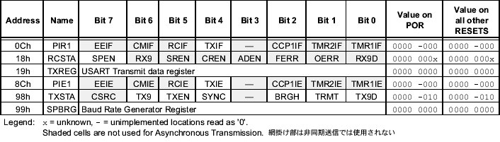 | bit 4 | SYNC: USARTモード選択ビット 1 = 同期通信モード 0 = 非同期通信モード |