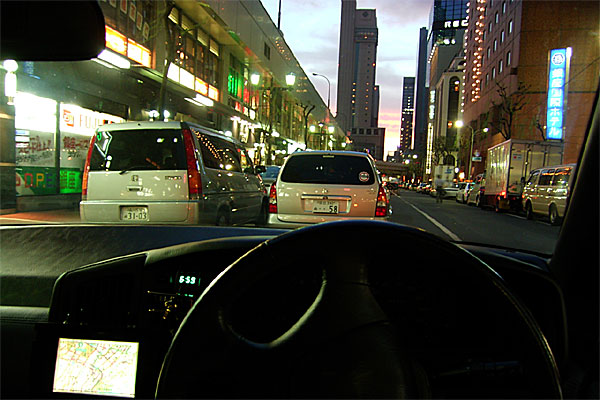 なんとか気を取り直して、高速へ乗り、ドーンと都内へ。乗せてきた連中は、お台場、六本木ヒルズ辺りを見たいというので、新橋辺りのホテルへ向かった。……が、スゲェ渋滞。ナビのおかげで迷わなかったとはいえ、あの辺りの道は車線の配置まで覚えてないと思うような方向に向かえない。別に銀座なんぞ案内したくはなかったのだが、成り行きで銀座のど真ん中を通って、新橋のホテル前へ。トホホ。