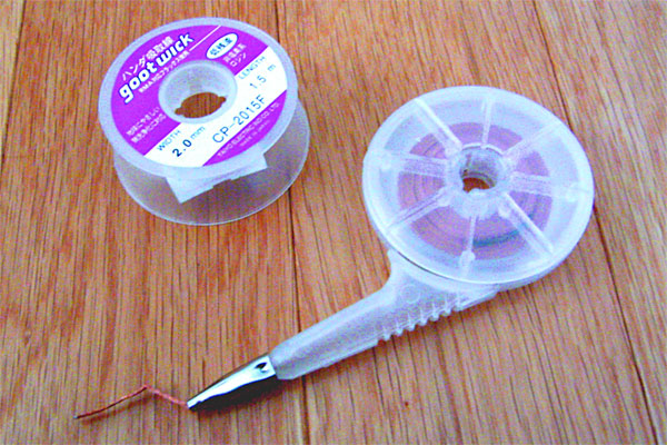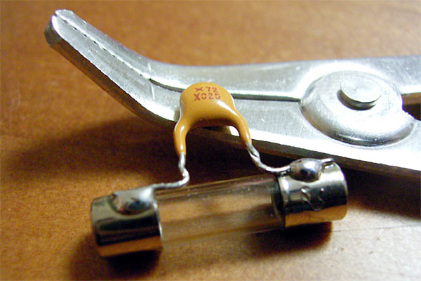 さて、安心したところで、ここ数日の疲れが出て眠くなったので、寝ぼけながらでもできるような作業をすることにした。まずは、愛用のテスターのヒューズ交換。といっても、今回は文字通りヒューズを交換するのでなく、ポリスイッチというヒューズの代わりになるパーツをヒューズに装着し、今後ヒューズが切れないようにしてみた。このポリスイッチというアイテムは電流が流れすぎると、内部の抵抗値が急激に上がり、冷えるまでは電気が通らなくなるという摩訶不思議な便利アイテムで、なんでもPCのUSBポートの内部には大抵挟まっているものらしい。