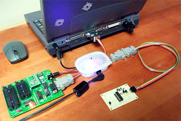 そして、動作チェック。スイッチをライタ側に倒して、PICのプログラミングOK。スイッチを逆側に倒して、テスト基板の動作もOK。通信中には、ちゃんと緑のLEDが点灯し、CTSに電気が来ていることが確かめられる。しかし、赤と青のLEDは……点灯しっぱなし。あれ?
