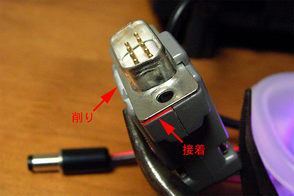 どーにかこーにかテスターでの導通チェックも完了し、配線に間違いがないことを確認した後、イザ接続! というところで、またまたケチが付く。秋月のライタへのシリアルケーブル接続の際、コネクタのガワがジャマしてちゃんと刺さらない。えぇい、切断。ガワの一部を切断すると、接続部分がひどくガタついてしまうが、瞬間接着剤で無理矢理ひっつける。