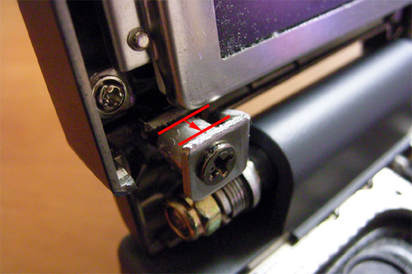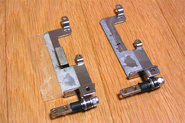 とりあえず対処として、ヒンジ側の折れたプレートを取り除くことにした。PCを閉じようとすると、ヒンジ部分が膨らむのは、このプレートが固着していることに起因するのだ。スパナで袋ナットを外し、プレートの破片を取り除く。取り除いたところで、とりあえず治しようもないので、そのままパネルの枠を元に戻してみたところ、左側のヒンジはグラグラするが(ヒンジを取り除いたのだから当然だ)、キチンとフタが閉まるようになった。というか、片方しか支えがなくなったのだからフタが閉まりっぱなしになって当然なのに、右側のヒンジだけで十分にパネルが支えられてしまう。これはつまり多板クラッチが重すぎて、それで破断したということではないのだろうか? すると、現在残った右側のヒンジにもかなり力がかかっているということになる。いずれにせよ、このままだといずれ右側も同じ事態になる可能性は高そうだ。