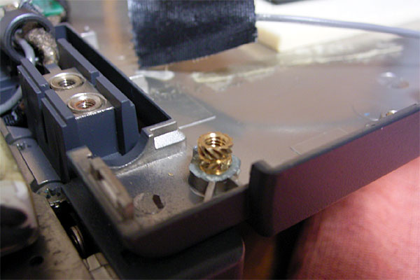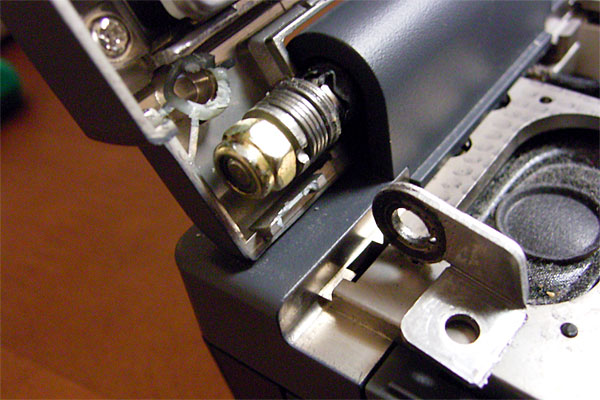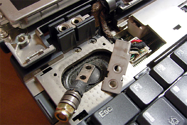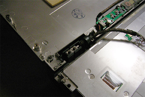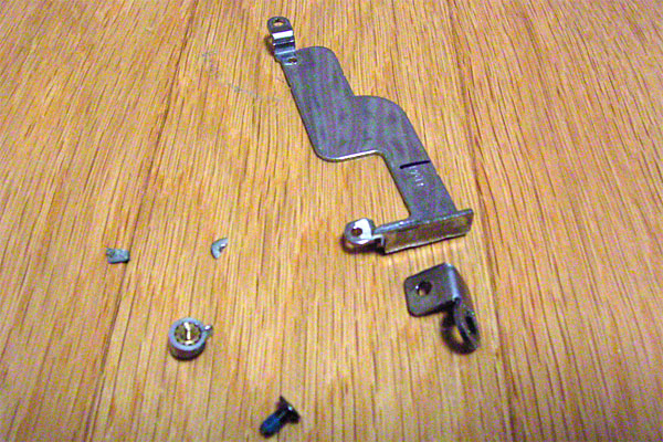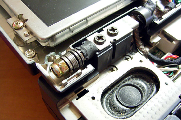 ヒンジ部が露出したので、状態を確認してみる。なるほど。LCDパネル側の金属製のプレートが、本体側の多板摩擦クラッチ付きのシャフトで貫かれている構造なのだが、プレートがブチッと破断してしまっている。しかも、LCDパネル側にプレートを固定している雌ネジが1箇所ポロッといっている。プレートは3箇所でLCDパネルに止まっているのだが、根元の雌ネジが折れたため、金属性プレートに負荷が転嫁され、プレートが逝ったらしい。