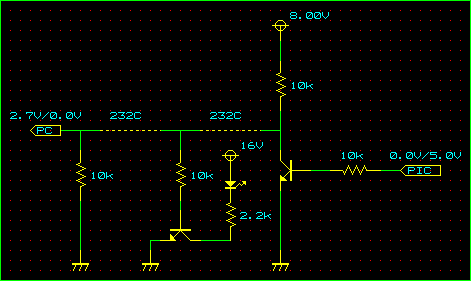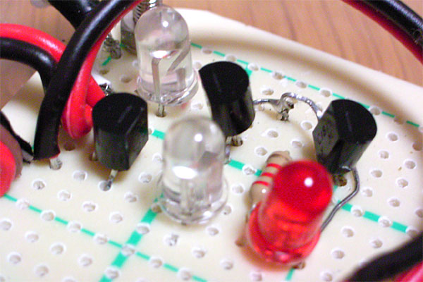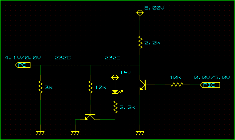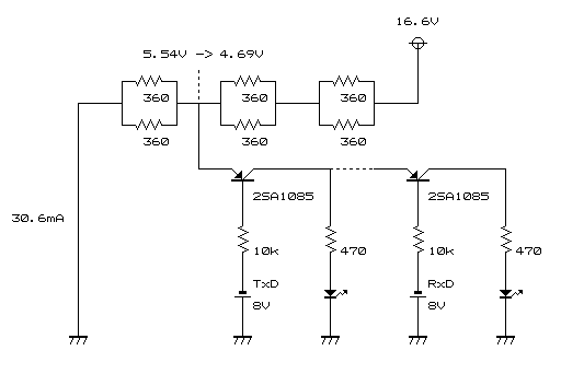 これは、PCからの通信電圧が±8Vに対して+16Vをブツけてしまったため、トランジスタがオフにならないのが原因なのである。RS-232Cの仕様としては最低±3Vもアリということなので、対処としては+16Vを+3Vに減圧してトランジスタのエミッタに供給してやればいいことになる。で、この3Vをどうやって作り出すか。手元には5Vの3端子レギュレータはあるが、3Vのものはない。そもそも、3Vにしてしまうと、LEDの最低駆動電圧もアヤしくなる。それに、たかがLEDのために3端子レギュレータを使うのももったいない。