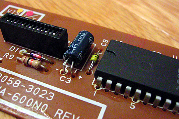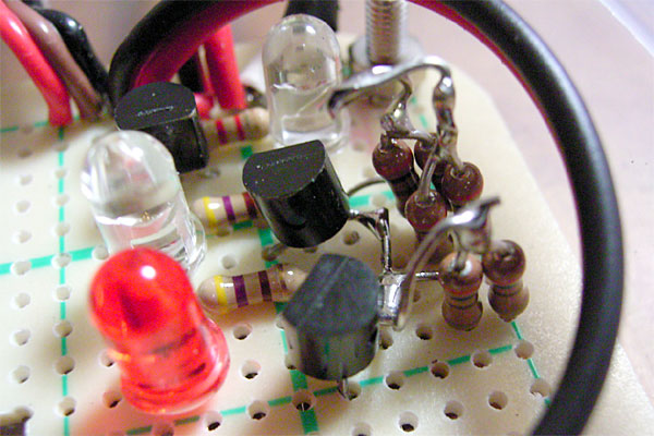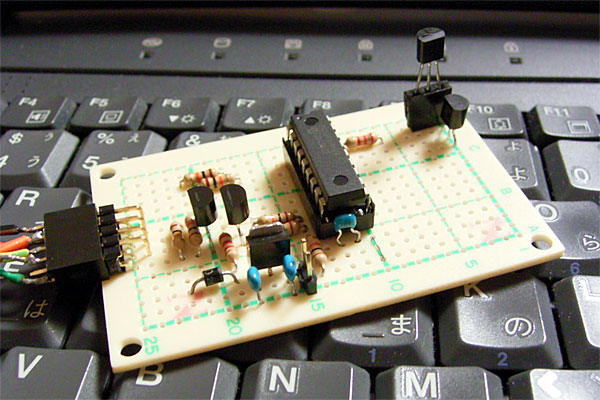 ただ、ここでただ転んではイケナイ。回路の修正の前になぜ現在の回路でLEDがまったく「消灯」しないか確かめなければ。わたしのカンが確かならば……というわけで回路はそのままに、できるだけHigh……じゃなくてLow(やっぱりまぎらわしいッ!!)の瞬間が多く出現するようにアスキーコード0x6Fの'o'(小文字のオー)を連続送信してみた。……よく見ると微妙に発光が弱くなっている、回路としては正しく機能していたのである。ついでにトランジスタのスイッチングスピードを上げるため、スピードアップコンデンサをハサんでみる……が、これは変化を確認できず。結局、人間の目には残像があるため、10%の点灯は確認できても、10%の消灯は確認しヅラいということだったのだ。