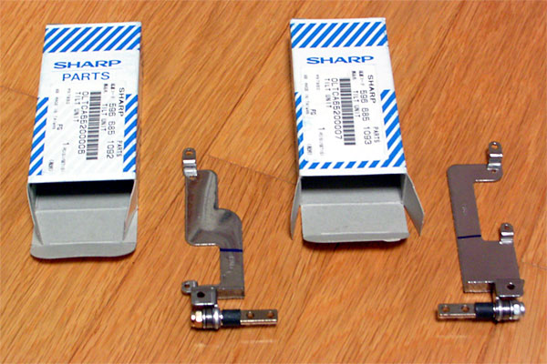 昨日、メビウスは応急処置を行ったものの、いわゆる片持ち状態であるからして、右側のヒンジへの負担は増大しているものと想像される。よく見れば右側の金属のプレートも勤続7年であるからして、かなりシワが寄っているように見える。元通りに修理するならば、破断した左側のプレートと、それを固定する雌ネジ(折れている)を保持している天板(LCDパネルの裏フタだ)を交換する必要がある。できれば、予防的に右側のプレートも交換したいところだ。で、早速、シャープの修理センターに電話してみた。