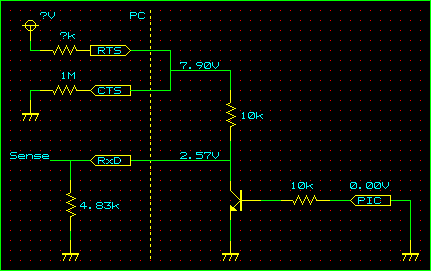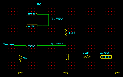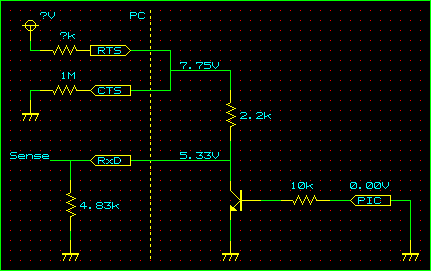 昨日、PCのシリアルポートのRxDピン内部に存在する抵抗値、いうなれば下流側の抵抗値を計算して推測したが、よく考えたらRTS-CTSピン内部の制限抵抗値、上流側の抵抗値も知ることができるのではないかと気づいた。しかも、新たに回路を起こしてテストする必要もなく、昨日のデータを元に再び方程式を解くだけである。
