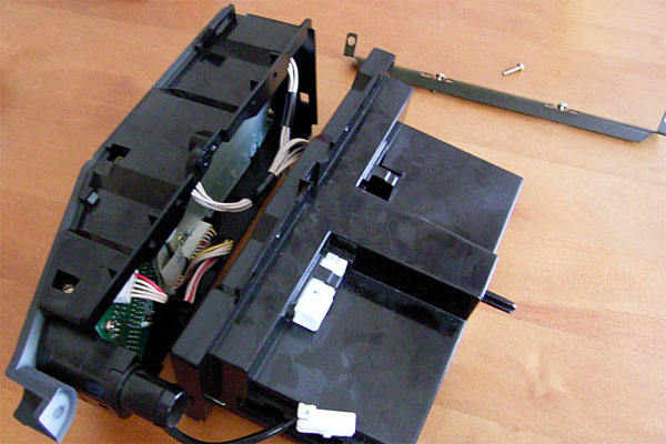 以下がその破断したプレートである。取り付けの場所柄、補強材を入れてつなぐわけにもいかず、ハンダでつないでも強度は足りないだろう。自分でイチから作れるほどの工具もないし、これは補修部品を当たるしかない。明日の朝にでもシャープに電話だな。