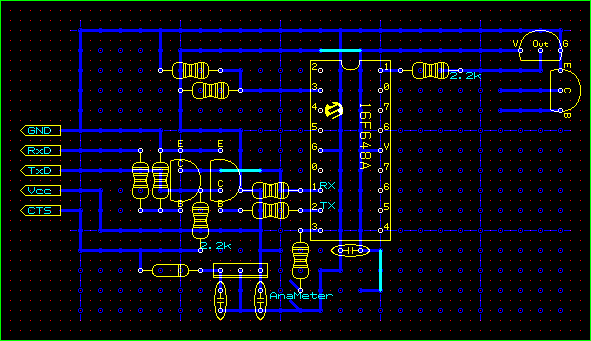 で、最後にアナログメータの製作の続きである。テスト基板からPCへの通信はできたのだが、PCからテスト基板への通信がさっぱりできない。そこで原因として閃いたのは「消費電流が多すぎではないか」ということだ。現在、テスト基板はPC側のRTS-CTSからの電圧のみで稼動しているが、もしかすると電流を引き出しすぎていて、PC側の送信電圧を食ってしまっているのではと考えたのだ。とすれば、テスト基板を外部電源で動かせばよいことになる。