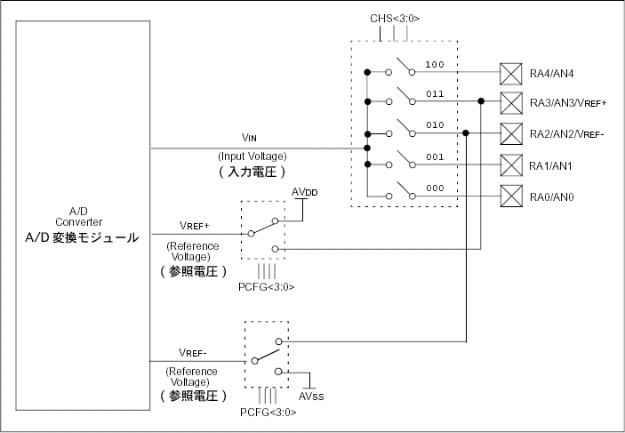 なお、A/D変換はCHSビット<2:0>とTRISビットの状態とは無関係に動作します。