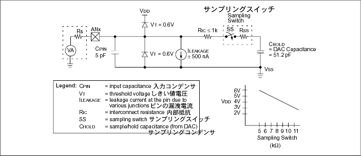 A/D変換を正しく行うためには、アナログ入力信号の電圧レベルに一致するまで、内部のサンプリングコンデンサ(CHOLD)を完全に充電する必要があります。アナログ入力モデルを図11-2に示します。外部抵抗の値と内部サンプリングスイッチ抵抗(RSS)の値は、CHOLDの充電時間に直接影響します。サンプリングスイッチ抵抗(RSS)はCPU電圧(Vdd)に依存します(図11-2参照)。外部抵抗の値は2.5kΩ以下を推薦します(外部抵抗の値が小さくなると、サンプリング時間も短くなります)。