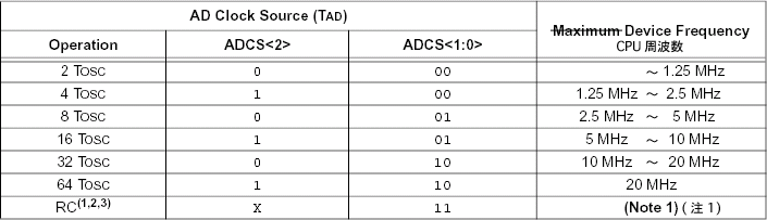 正しくA/D変換を行うには、TADが1.6us〜6.4usの範囲になるようにする必要があります。CPU周波数から求められる適切なTADとの関係を表11-1に示します。