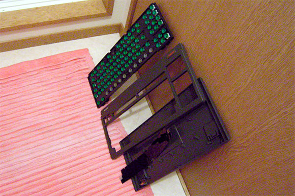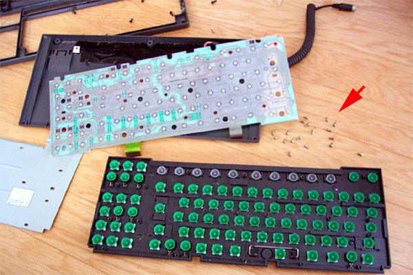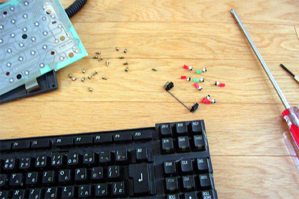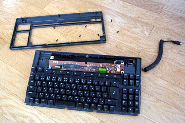 ちょっと前のおいらなら、かなりオッカナビックリと分解するところだが、最近は各種工作に励んでいるし、先日のSVXのエアコンの分解修理でもう達観してしまっているので、バリバリとバラす。バラしは経験と思い切りだな。以前にキートップを外してネットで洗うとよいと聞いていたので、キートップを外そうと思ったが外れない……というか、バラしているうちにそういう構造じゃないっぽい事に気づく。固い鉄板の上にスイッチシートがあり、その上に半球状のゴムで支えられるキートップがある構造だ。最近のキーボードならキーの反力と接点をビローンと1枚のゴムシートで済ませてしまうところだぜ。こりゃ貴重なキーボードだ。金もかかっている。しかし、そんな感激も冷ましてしまう、ホコリ、髪の毛、ポテチ、虫の死骸、○○、××と内部はスゲェ惨状だ。