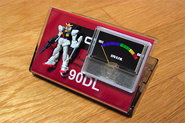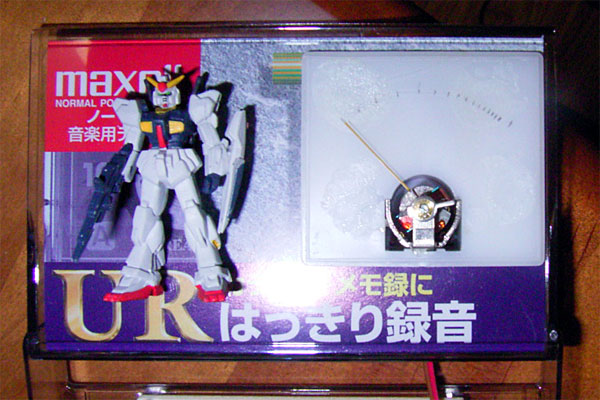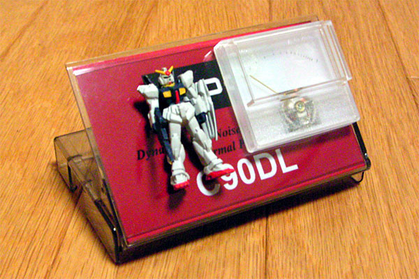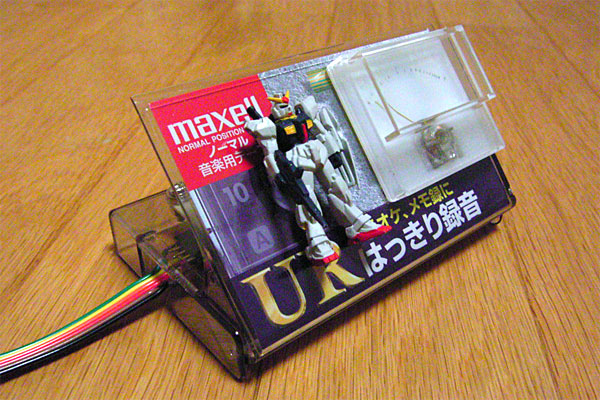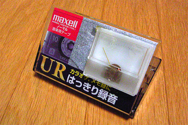 実は、今日の作業のほとんどは昨日行ったのだが、便宜的に今日分にまとめて書いてしまおう。例のアナログメータであるが、基板とアナログメータをケースに組み付け、ケーブルで接続、一応パッケージングが完了した。大変チープであるが、それもまぁ狙いである。できれば、カセットレーベルはもう少しレトロ調のモノ、UDIとかLo-Dとかがよかったが、サスガにそんなモンとってあるハズもない。