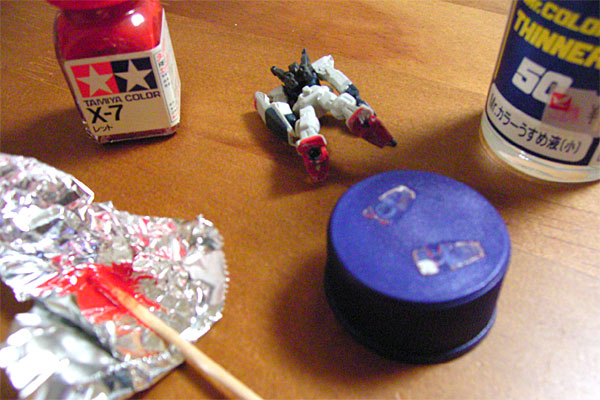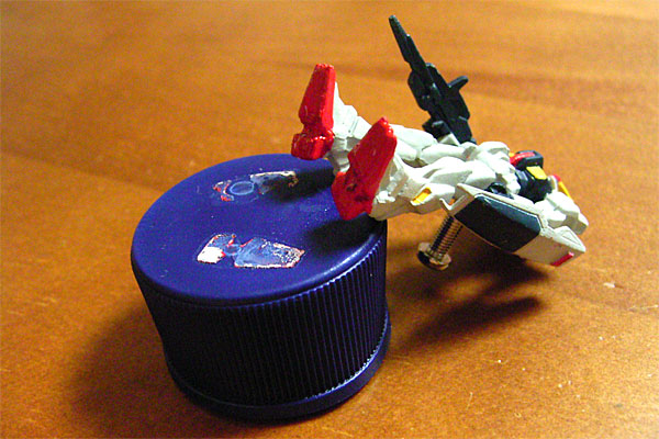 で、こいつを空白部分にでもひっつけて、空きを埋めることにした。ボトルキャップがついているとカッコ悪いので、ニッパーでチョッキン。足の塗装がハゲたので、たまたま残っていた固まりかけている塗料を薄めて楊枝の先でコテコテと塗りつける。うーむ、一体ナニをやっているのだろう、と自らに疑問を投げかけつつオシリ部分にφ2.5mmドリルを突き立て、5mmほど掘り込んでタッピングで雌ネジを掘る。