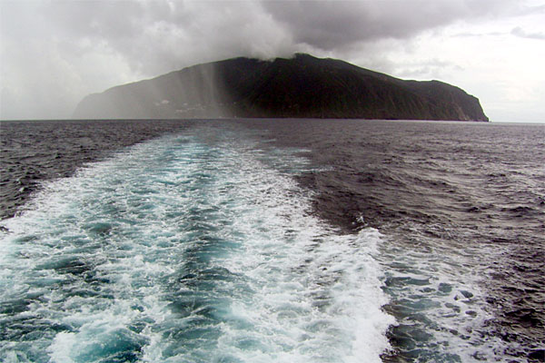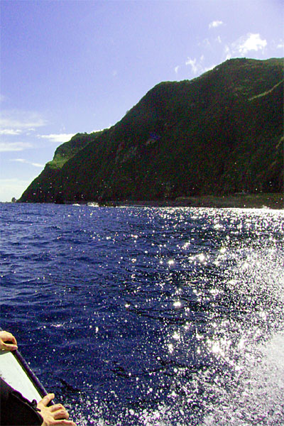 それから1時間ほどすると御蔵島である。しかしこの御蔵島、現在の世にあって「条件付」という出航スタイルがとられている。というのも、防波堤がないのである。つまり、島からは桟橋がピョンと出ているだけで、そこは外洋に面しているため、海が荒れると船は「通過」なのである。そのため運行側は「条件付」という逃げを打っていて「着かない場合、金返すから、ゴメンすれ」ということになっているのである。幸い、今回は非常に海は穏やかなので無事到着することができた。