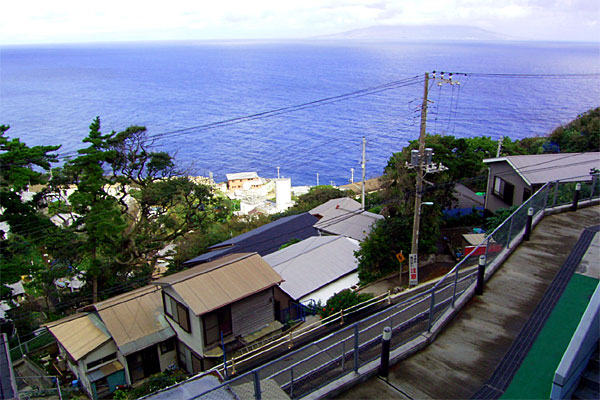 さて、昨日ぐっすり寝たので、体力も復活である。部屋の窓から写真を撮ってみる。遠くに見えるのが三宅島である。なお、この宿は「里」と呼ばれる御蔵島の人里のほぼ一番高いところに位置しており、この角度で写真を撮るとそのほぼ半分が納まってしまう。人が住んでいるのは、小さな御蔵島の1%にも満たない場所なのである。港1つ、商店1つ、食堂1つ、郵便局1つ……2つある施設のが少ないくらいだろうな。