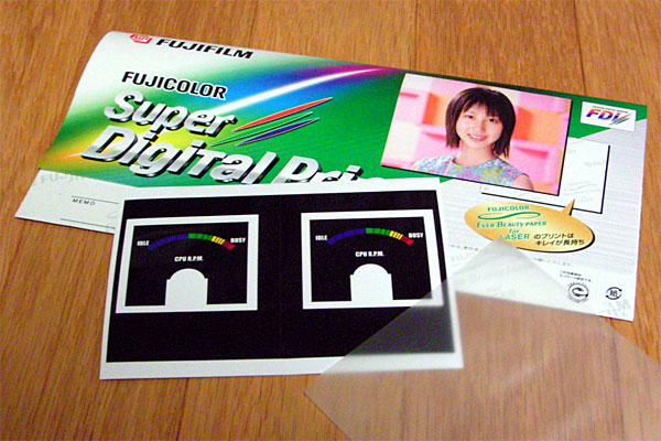今日は再び写真屋さんにコンパクトフラッシュを持っていく。先日、例のLo-Dのなんちゃってカセットレーベルをお願いしたら、ほぼピッタリサイズに焼いてくれたので、今回はアナログメータ内のパネル画像をお願いするのだ。なにせこっちはミリ単位で合わないとカッコ悪いことになる。とはいえサイズは前より小さめなので、前回のLo-Dの誤差範囲に収まればキッチリ入ることだろう。プリンタは300dpiだという情報をもらっているので、今回はpsdファイルをキッカリ300dpiに合わせて持っていく。また今回のサイズだとL版では2枚分取れるため、予備用に横に2枚並べ、真中に1ドットの筋を入れてみる。この1ドットの筋が印刷されていれば文字通り300dpiの解像度があるということもわかる。