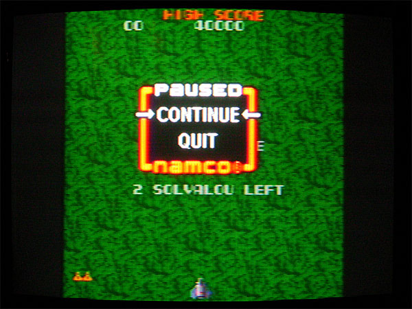 今作は前作の続編的な位置付けながら、電池ボックスが底面から背面に移動しており、前作のものとは大きく形状が異なっている。これは大きな変化ではあるが、持ちにくい形状であることに変わりはない。ケーブルは前作と同じくRCAピンの黄色と白。もとのゲームがモノラルであるからこれで問題ない。レバーに関しては、ポールポジションのためにレバーを「ヒネル」入力が可能となっている。例えるならSNKの「IKARI怒」のような動きであるが、そこはハンドルであるからして手を離せばバネで中央に復帰する。こんなレバーは初めてみたが、8方向移動+ヒネリという入力デバイスはうまく生かせば面白いアクションができそうである(ソルバルウを横に向けたりできるとか!!)。あ、そうそう、前作では「ボスコニアン」が8方向レバー仕様のゲームであるにも関わらず、ハードは4方向レバーというスカポンタンなオチがあったが、今回は清く正しく8方向レバーである。安心して欲しい。その一方で、ボタンに関しては前作と同じく比較的重く、カチカチと音を立てるクリック感のあるタイプで、大きさもやや小さいため連射しにくい。「ゼビウス」「ギャラガ」等、前作のラインナップより連射の必要性が高くなっているゲームが多いので、若干ツライところではある。なお、今作も右レバー、左ボタンと配置が一般のアーケードのものと逆になっているので、人によってはやりにくく感じるだろう。最後に、前作に引き続きリセットスイッチが存在するが、これについては大いに改良されていて、ハードウェアリセットのボタンでなく、リセットメニューを開くためのボタンとなっている。リセットメニューではCONTINUEとQUITを選択することができ、当然ながらその間ゲームは停止するため、ポーズ機能の代わりにも利用可能だ。個人的にはポーズ無しの方が緊張感があって好みだが、一般的には大きな改善といえよう。また、リセットスイッチの位置も手前に移動しており、プレイ中に誤って押す可能性を排除している。たかがオモチャであるが、この辺りの改善を怠らないところは大いに評価できる。