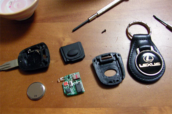 さて、そんなこんなでネズミ場から帰るなり、SVXのキーをバラし始めるのであった。出かける前に、カミさんに持たせてある「複製キー」で開錠を試したところ動作したのだ。よってドア側に問題はない。カギ側の電池切れかもしれない。んじゃ、バラして電池を入れ替えれば直るだろう。
