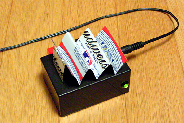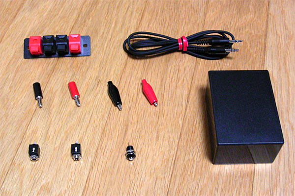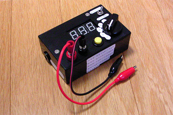 で、先日購入したバナナジャックを取り付けつつ、コードの両端にバナナプラグとワニ口をハンダ付けする。よっしゃ、完成。以前に秋葉で格安で買ったミッキーマウスのテープライターを使い、操作パネルに注釈を入れてみる。ちょっと安っぽいが、まぁいい。よしとする。するったらする。