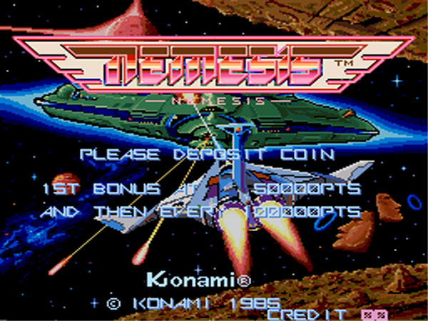 よくみたら、置いてあったのは海外版のグラディウスの「ネメシス」だった。内容はあまり変わらないらしいが、下の写真に示すようにタイトル画面のバックがイメージCGになっていたり、パワーアップゲージのOPTIONがMULTIPLEになっていたり、若干難易度が高くなっているとか聞く。まぁ、大した違いではないだろう。しかしこのゲーセン、古いゲームが多いのだがレトロゲーなラインナップを狙っているのだろうか? 非常に中途半端な機種揃えである。しかも異様にコラムスの台数が多い。5台くらいある。意図不明だ。単に新しい基板を買うお金がないようにも見受けられる。まぁどうでもいいや。ガギゴギゴーン(←コイン音)。