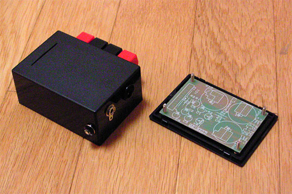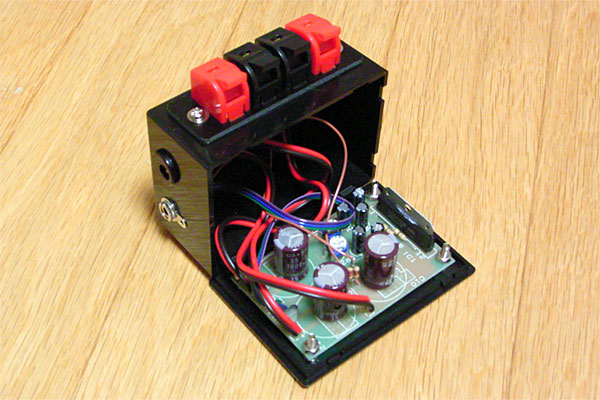 で、動作確認だ。ケースを閉じる前に実際のテレビにつないでみる。テレビのスピーカーにつながっているスピーカーケーブルを外し、キットのスピーカーコネクタにつなぐ。ACアダプタからDCジャックに電源を供給し、テレビのヘッドフォンジャックとキットのステレオジャックをケーブルで接続する……えっ……ウンともスンともいわないんですが……なんで?